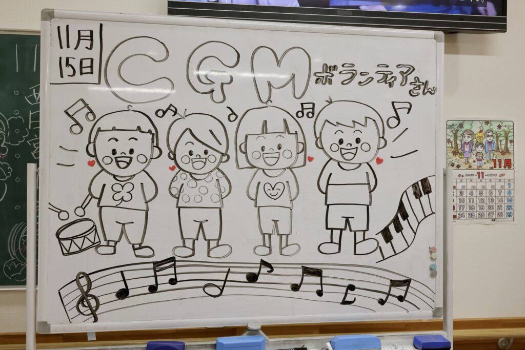 施設にはホワイトボードに「歓迎のかわいいイラスト」が描いて会ってテンションアップ⤴️